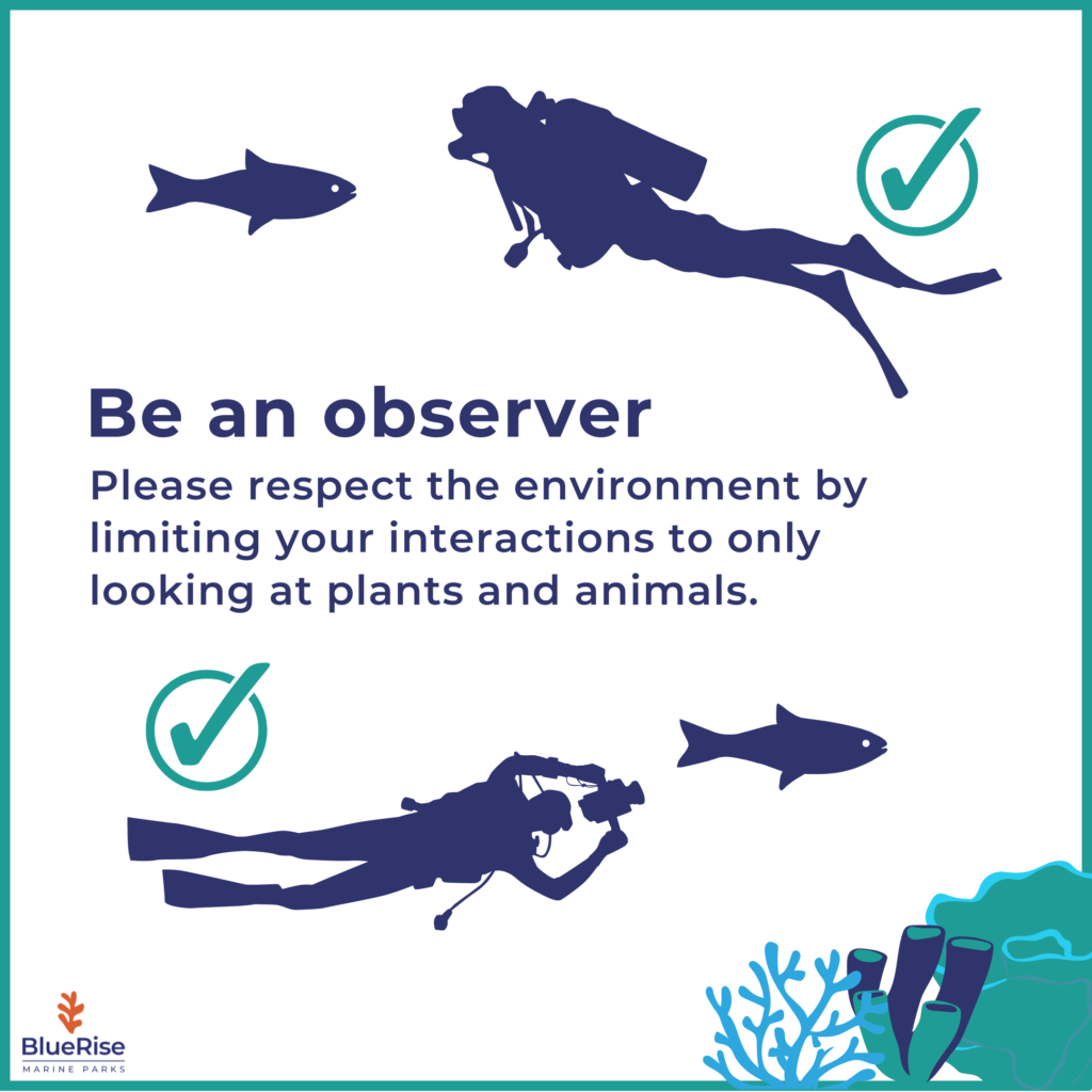 • Especially if you’re new to snorkelling or diving, stay close to your guide, and with the group. This will help you avoid straying into sensitive areas.
